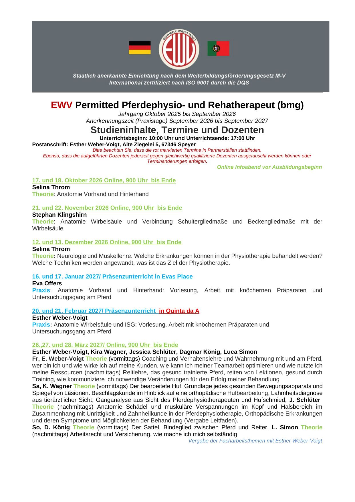 Temos vindo a formar com sucesso fisioterapeutas equinos e terapeutas de reabilitação (bmg) desde 2010. A formação é realizada na Alemanha em 2 locais principais, em Walldorf, perto de Heidelberg, e em Deining, perto de Nuremberga. A fim de capacitar os alunos para a prática de uma ampla gama de disciplinas, estilos de criação, raças e idades, as unidades práticas ocorrem em diferentes estábulos.