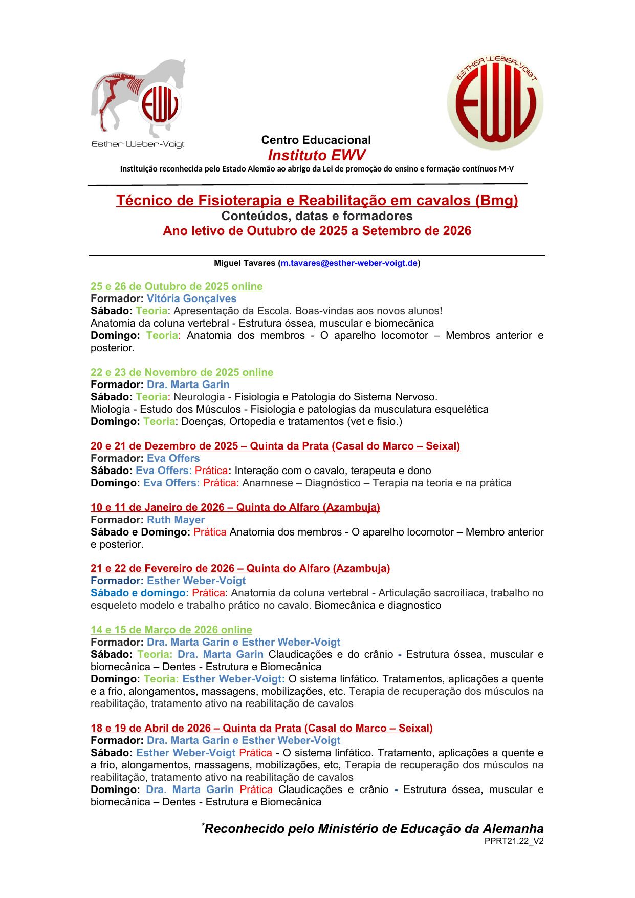 Desde 2013 que trabalhamos com o nosso próprio livro didático, o Caderno EWV, Avaliando, Tratando e Treinando Cavalos, que receberá no início do curso via WeTransfer.